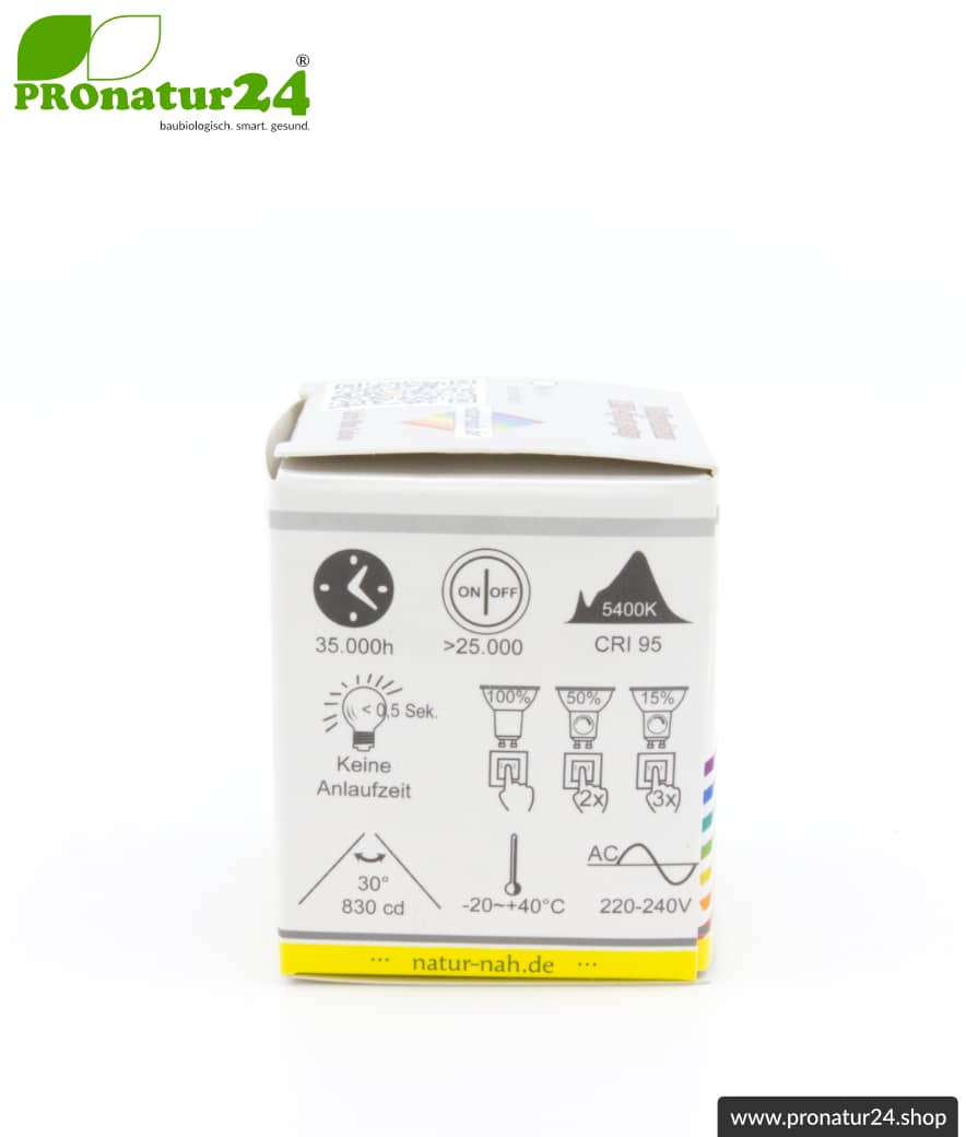 Vollspektrum LED Spot 3step mit 6 Watt. Flimmerfreies Natur-nah Licht nach dem Vorbild der Sonne mit CRI 95. Farbtemperatur 5400 Kelvin. Hell wie eine 35 Watt Halogenlampe. GU10 Fassung. Dimmen ohne Dimmer in drei Helligkeitsstufen: 100%, 50% und 15%. GU10 Fassung.