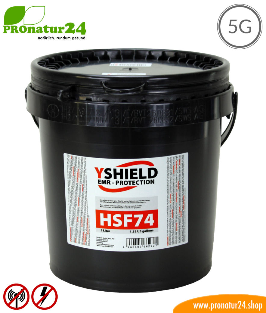 Die Abschirmfarbe HSF74 von YSHIELD ist bestens geeignet zur sehr effektiven Abschirmung von Belastung durch Elektrosmog von Funkstrahlung und elektrischen Wechselfeldern. Funkbelastung von Mobiltelefonen, mobilem Internet, WLAN, DECT, GSM, LTE, uvm. werden bis zu 45 dB geschirmt was einer Effektivität von 99,997% entspricht. Elektrische Felder vom Hausstrom (Wechselstrom) werden äußerst effektiv geerdet und können vollständig bis zu 100 % geschirmt werden (identisch zu PRO54, HSF54 und HSF64).