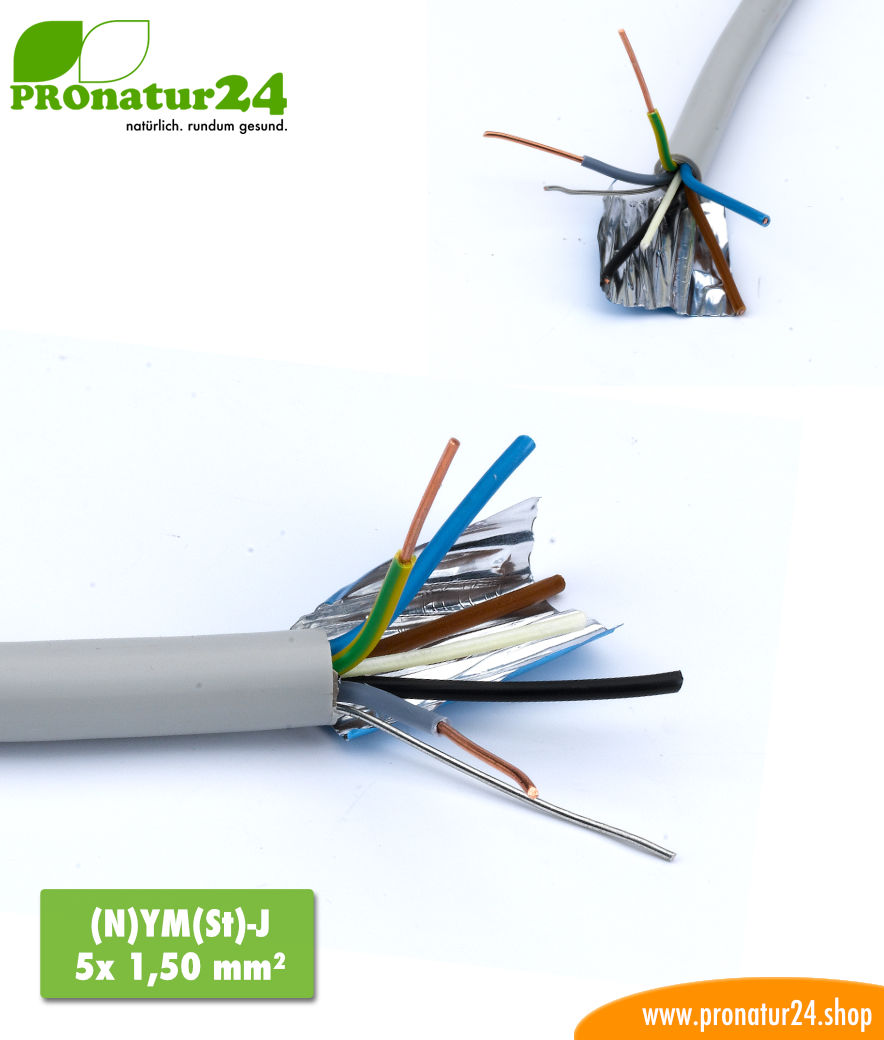 Günstige geschirmte Elektro Kabel Mantelleitung zur Vermeidung von NF Elektrosmog durch Stromleitungen. BIO Elektrokabel Typ (N)YM(St)-J in preisgünstigen Varianten.