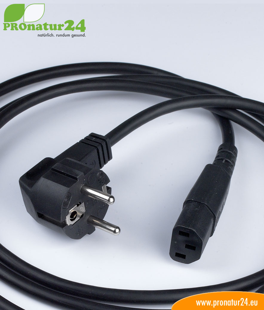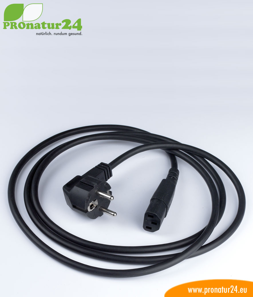 Mit Kabel (H)05VV-F3G zur Abschirmung niederfrequenter elektrischer Wechselfelder. Zur Minderung des magnetischen Feldes sind die Adern 15 mal pro Meter verdrillt.