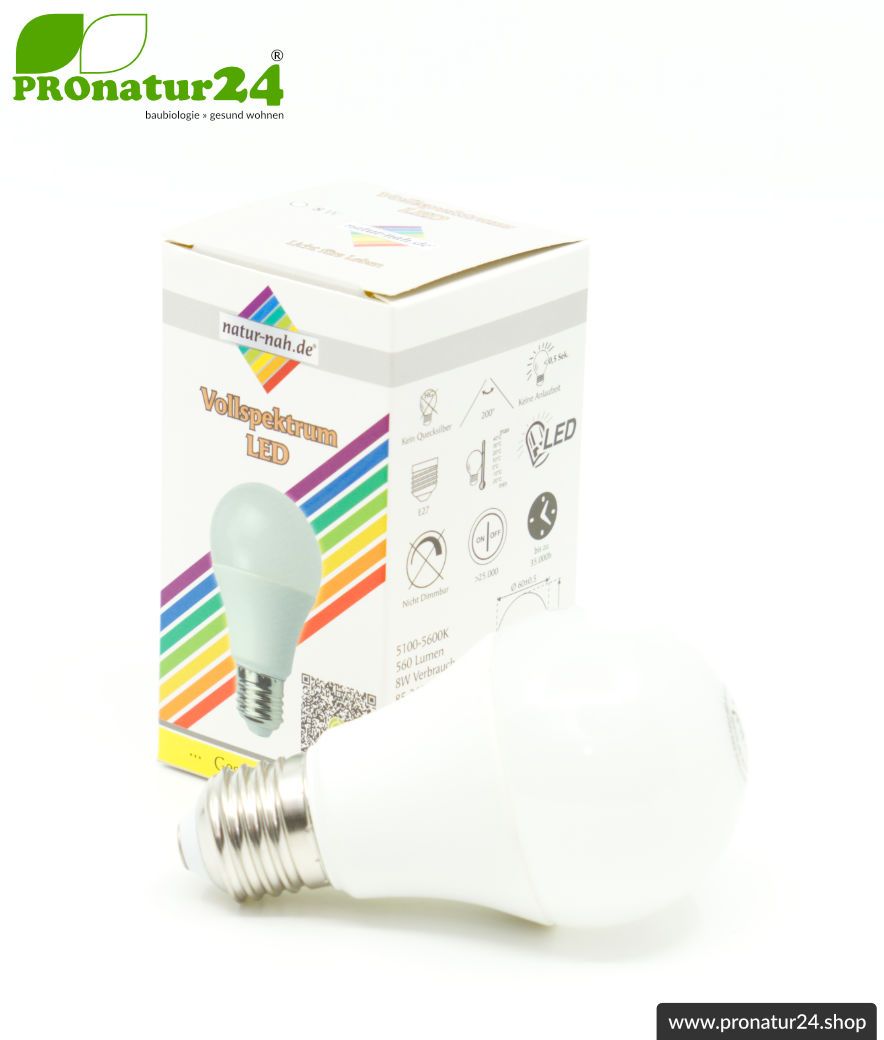 Vollspektrum Tageslicht LED Lampe mit 8 Watt. Flimmerfreies Natur-nah Licht nach dem Vorbild der Sonne mit CRI 95. Farbtemperatur 5200 Kelvin. Heller als eine 60 Watt Glühbirne. E27 Fassung. Nicht dimmbar.