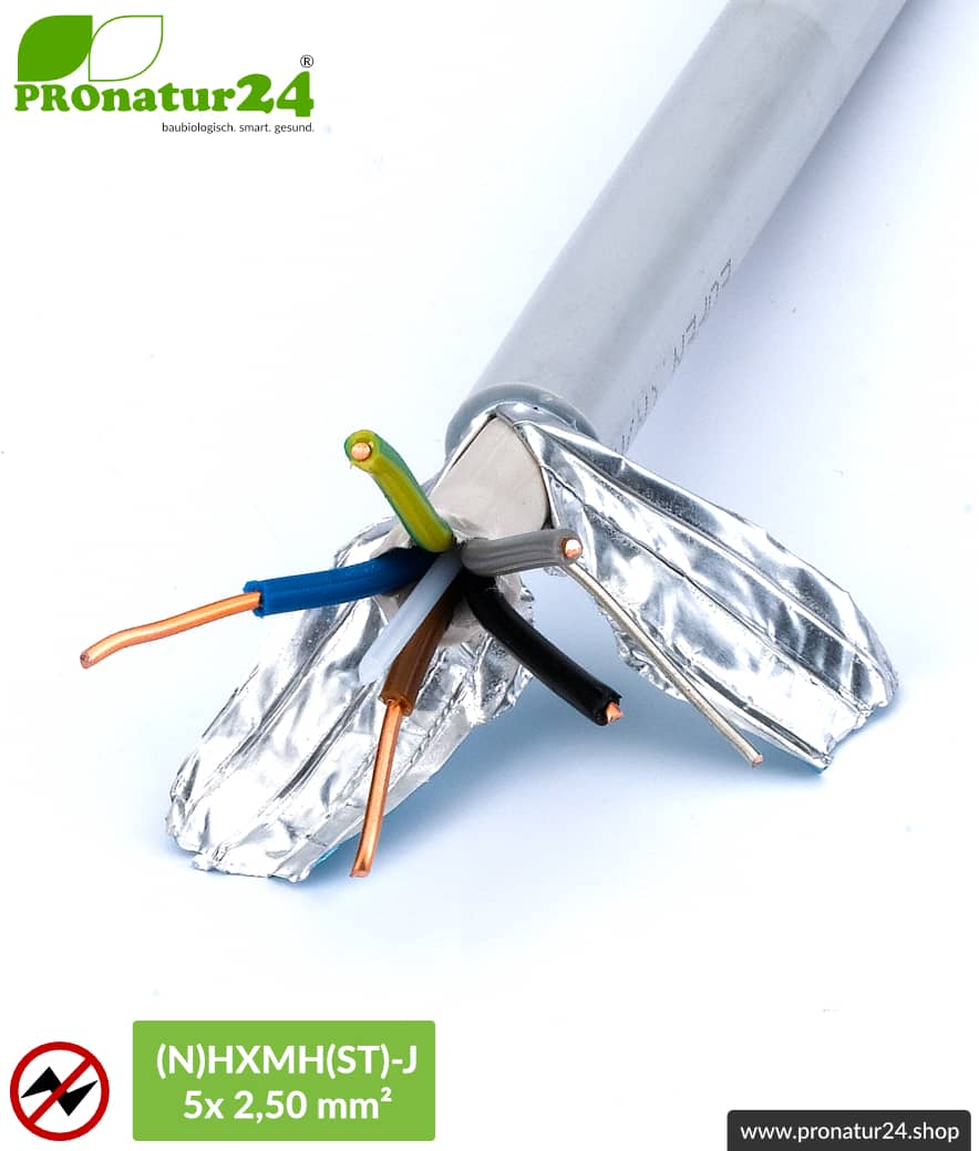 Diese hochwertige geschirmte Mantelleitung ermöglicht die effektive Abschirmung niederfrequenter elektrischer Felder. Im Gegensatz zum geschirmten PVC Kabel ist diese Variante (N)HXMH(St)-J einer geschimten Mantelleitung zudem halogenfrei und weichmacherfrei. Weiters wurde hier ein verbessertes Verhalten im Brandfall integriert. Man bedenke das ein Standard Elektrokabel, verlegt beim Bau der Wohnung oder Haus, eine starkes elektrischen Wechselfeld produziert welches bis zu 2 Meter in den Raum reicht. Und da die Stromleitung im Boden, Decke oder Wand fortlaufend unter Strom mit 16 Ampere und 220 Volt stehen, ist diese NF Elektrosmogthematik ein 24/7 Thema – 24 Stunden und 7 Tage der Woche.