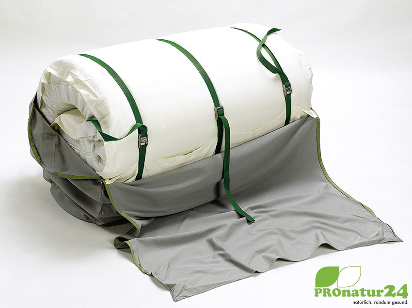 Die Schutzhülle legen Sie am besten zurück in die Schachtel und verstauen diese für den Rücktransport. Die Schutzhülle ist limitiert wasserabweisend und verfügt über eine ca. 2,5 Meter lange Stoffschleppe um die Matratze vor Verschmutzung zu schützen.
